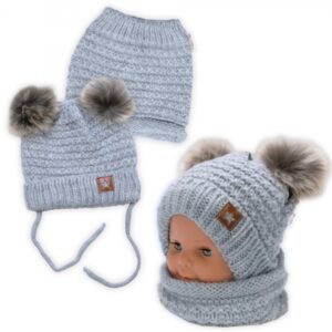 Zimná pletená čiapka Star s fleecom a chlpáčkové brmbolce + komínček 2D sada, sivý melírok