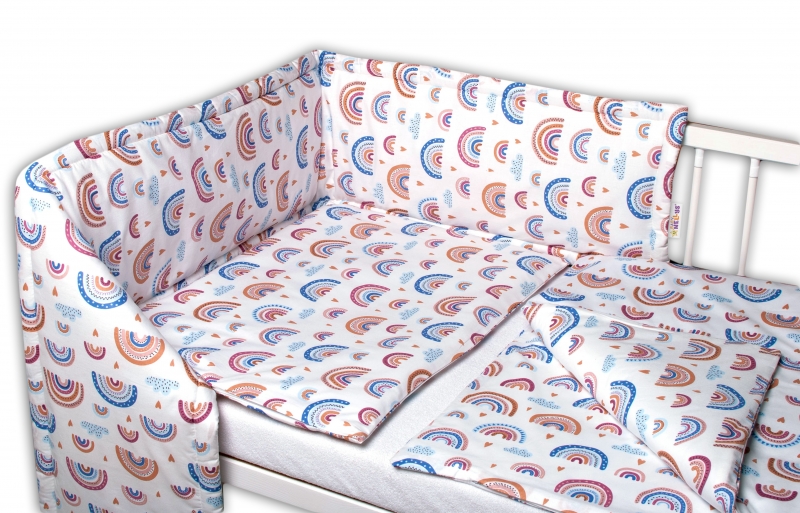 120×90 – obliečky na perinku 120x90cm, obliečky na vankúšik 40×60 cm, mantinel 60x60x60cm – na postieľku 120x60cm.