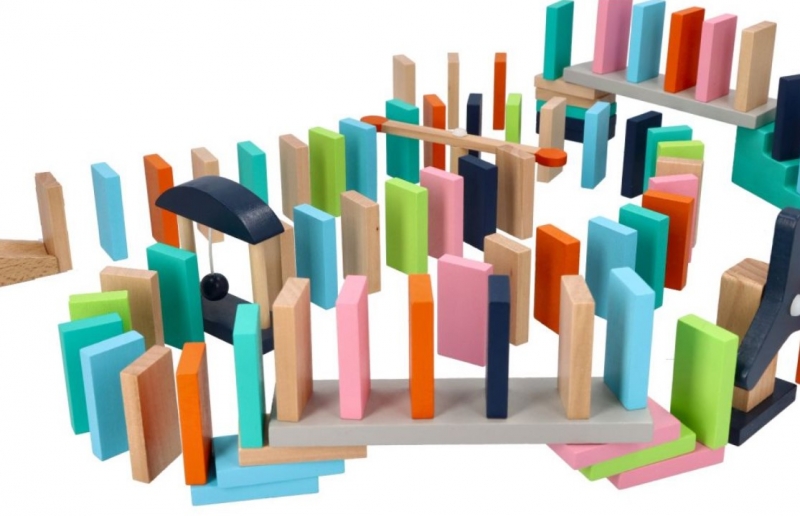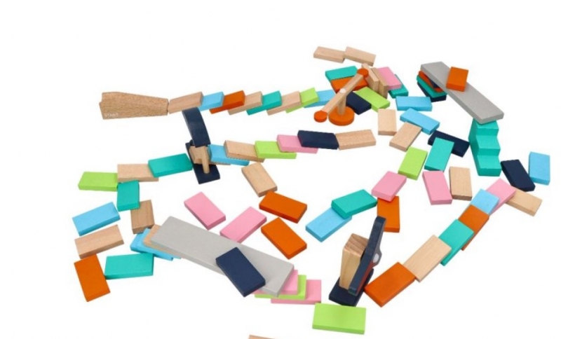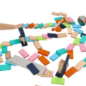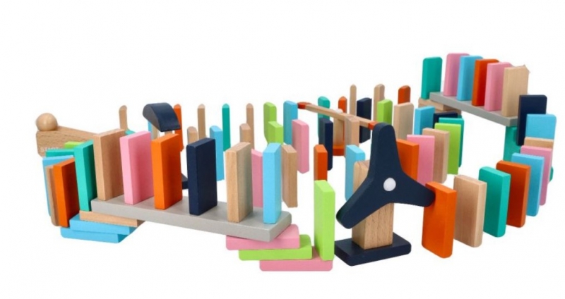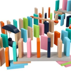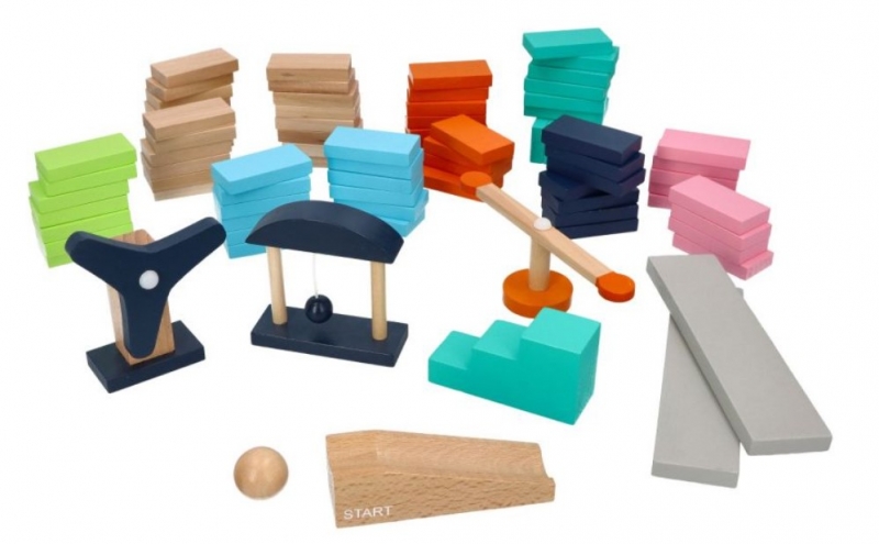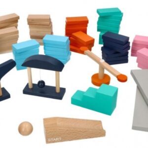 Súprava obsahuje drevené kocky, vďaka ktorým môžete aranžovať rôzne kombinácie, vďaka čomu sa hračka príliš rýchlo neomrzí. Váš vyklápací pruh môže vyzerať zakaždým inak. Ďalším spestrením sú prvky ako otočný kolotoč, veterný mlyn, schodíky alebo guľová brána. Teraz stačí nastaviť štartovací sklz, pritlačiť loptičku a zábava môže začať.