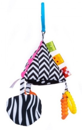 Hračku zdobia farebné hryzátka a praktická pracka, ktorá vám ju umožní pripevniť kamkoľvek.