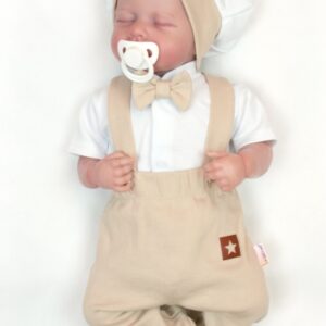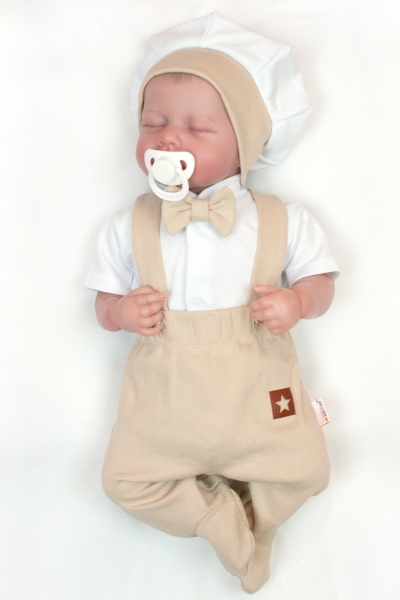 Táto bavlnená súprava je určená pre malých gentlemenov, ktorí milujú šarm a eleganciu. Obsahuje celorozpínacie body s krátkym rukávom a nádherným motýlikom, ktorý nie je odnímateľný, polodupačky s láclom z rebrovaného bavlneného materiálu a roztomilým baretom, ktorá dodáva celému outfitu šmrnc.