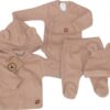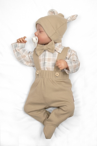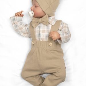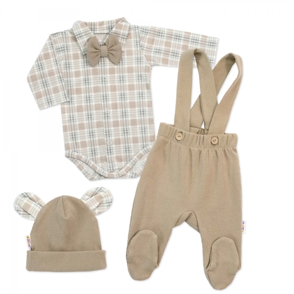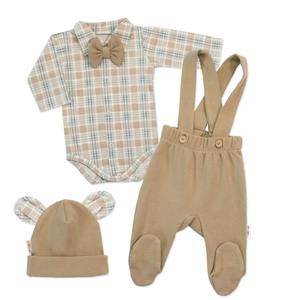 Táto bavlnená súprava je určená pre malých gentlemenov, ktorí milujú šarm a eleganciu. Obsahuje celorozopínacie body s dlhým rukávom a nádherným motýlikom, ktorý nie je odnímateľný, polodupačky s lakom z rebrovaného bavlneného materiálu a roztomilú čiapočku s uškami, ktorá dodáva celému outfitu šmrnc.