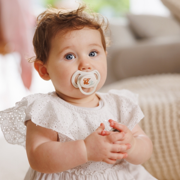 V balení nájdete 2 cumlíky – jeden určený na denné používanie a druhý so svietiacou rukoväťou, ktorý ľahko nájdete aj v noci v postieľke či pod perinkou.