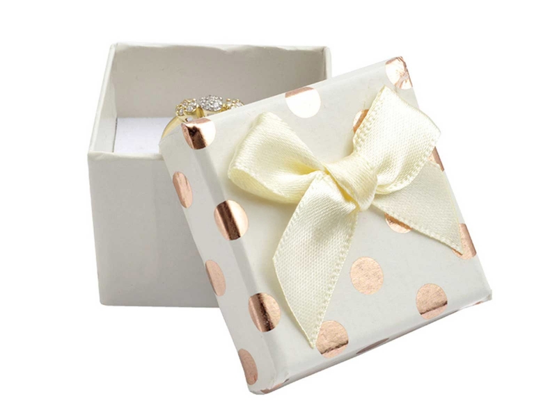 Krabička v krémovej farbe je ozdobená zlatými bodkami, ktorá ju robí rafinovanú a ideálna pre rôzne príležitosti – od narodenín až po svadby.