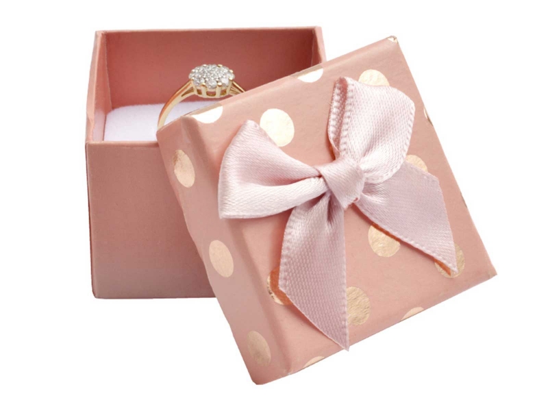 Krabička v pudrovo ružové farbe je ozdobená bodkami, ktorá ju robí rafinovanú a ideálna pre rôzne príležitosti – od narodenín až po svadby.