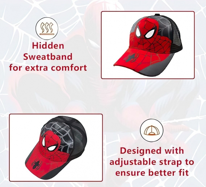 Prednú časť zdobí výrazná potlač Spidermana, ktorá dodáva moderný mestský vzhľad. Dizajn je hravý, farebný a priťahuje pozornosť – šiltovka sa tak ľahko stane obľúbeným kúskom v detskom šatníku. Vyrobená je z ľahkého a priedušného materiálu, ktorý dobre odvádza pot a udržiava hlavičku v suchu aj počas teplých dní. Pevný šilt chráni oči pred slnkom, zatiaľ čo zadná časť so sieťkou zaisťuje priedušnosť. Nastaviteľné plastové zapínanie umožňuje ľahké prispôsobenie veľkosti.