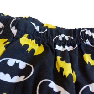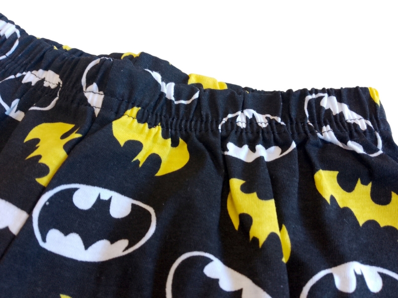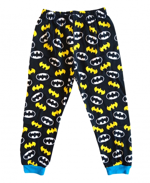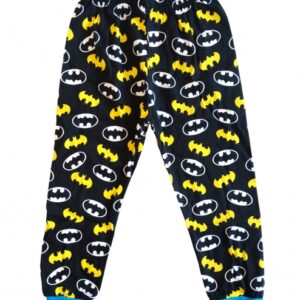 Kalhoty jsou navrženy v černém provedení s celoplošným potiskem netopýřího loga v typických žluto-černých barvách. Díky elastickému pasu perfektně sedí a neškrtí, což zajišťuje pohodlí při nošení. Nohavice jsou zakončeny modrými náplety, které ladí s detaily na tričku a zabraňují vyhrnování během spánku. Materiál je příjemný na dotek a zajišťuje dostatečnou prodyšnost pro klidný noční odpočinek.