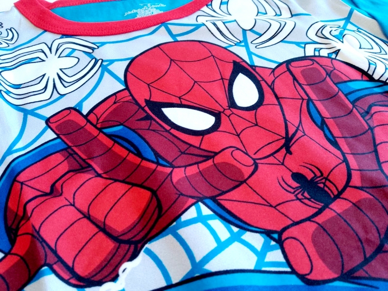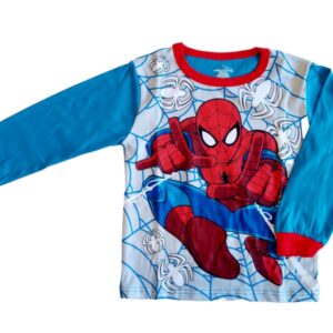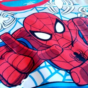 Pyžamový set se skládá z dlouhého trička a pohodlných kalhot, které společně vytvářejí dynamický a akční design. Hlavní dominantou trička je velký potisk Spidermana v akční póze, připraveného vystřelit pavučinu. Pozadí je doplněno bílými pavučinami a pavouky, což ještě více umocňuje autentický komiksový vzhled. Modré rukávy a kontrastní červené manžety dodávají tričku moderní a hravý styl.