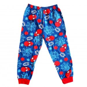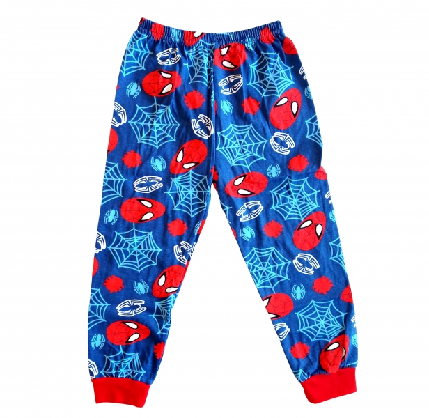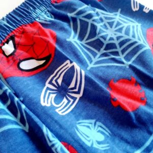 Kalhoty jsou v tmavě modrém provedení s celoplošným potiskem pavučin, pavouků a Spidermanových masek v typických červených a bílých barvách. Díky elastickému pasu se kalhoty pohodlně nosí, neškrtí a umožňují volný pohyb. Červené manžety na nohavicích zabraňují vyhrnování během spánku a zároveň perfektně ladí s barevným provedením trička. Tento design dává pyžamu dynamický a akční vzhled, který si děti okamžitě zamilují.
