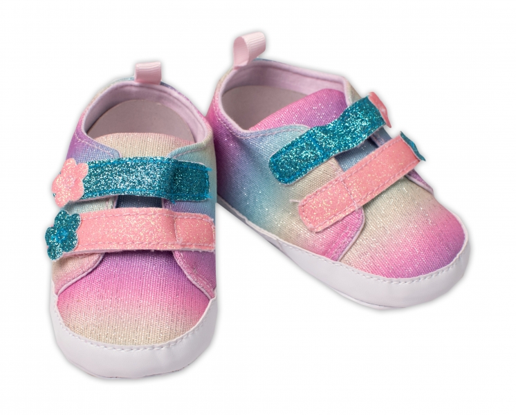 Roztomilé dievčenské topánky v dúhových, pastelových farbách. Zdobené trblietkami. Ideálna pre každodenný styling. Vďaka zapínaniu na suchý zips perfektne sadnú na detskú nohu.
