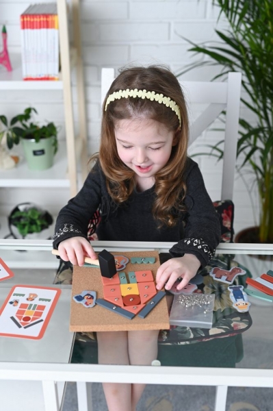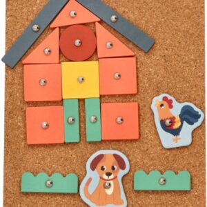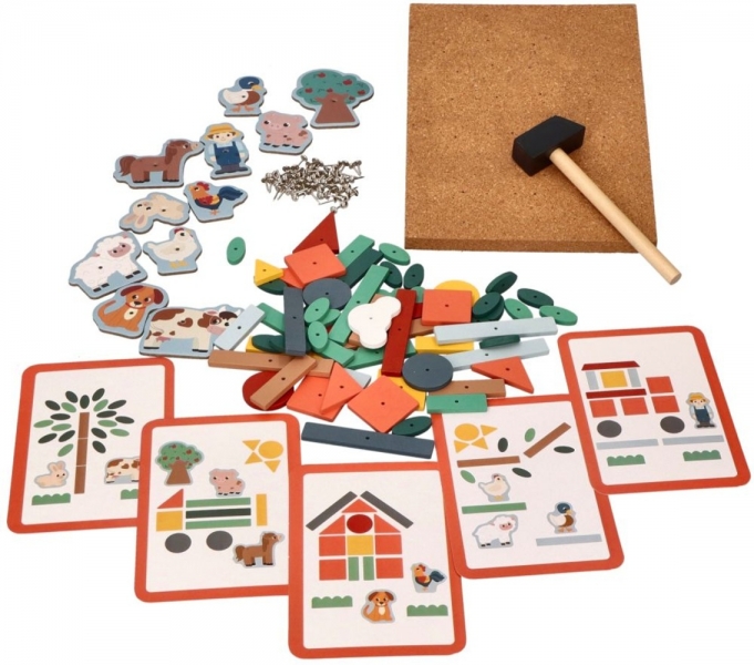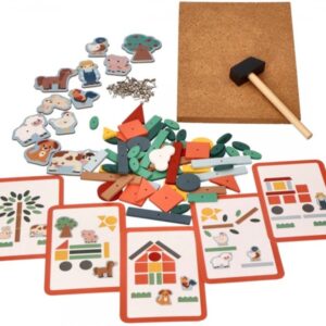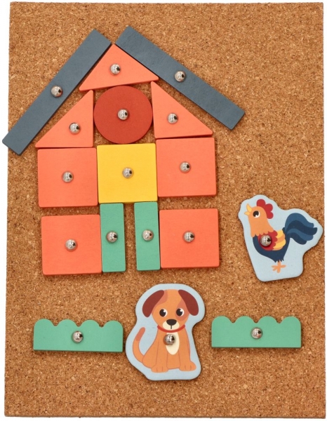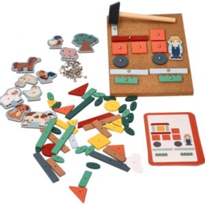Magická zábava s kladivom a pripináčikmi. V balení nájdete korkovú dosku, kladivo, pripináčiky a drevené objekty rôznych tvarov. Deti si môžu na doske vďaka zatĺkačke vytvoriť rôzne obrázky.