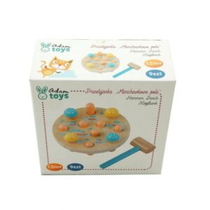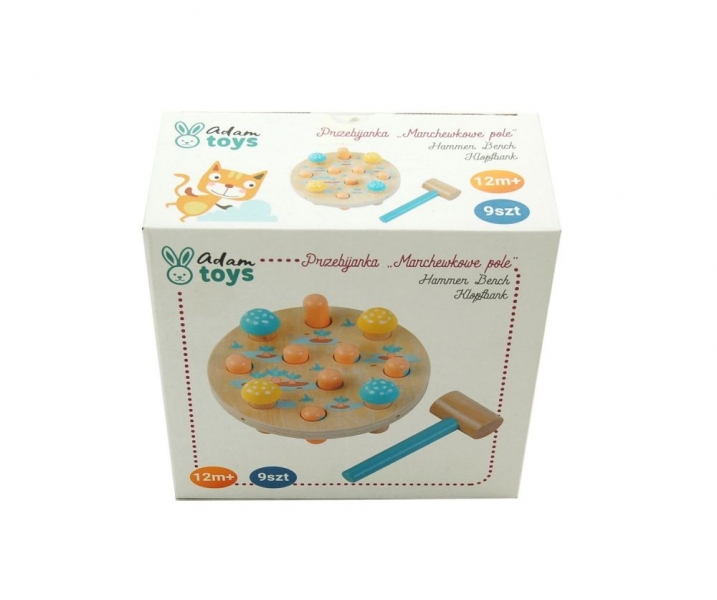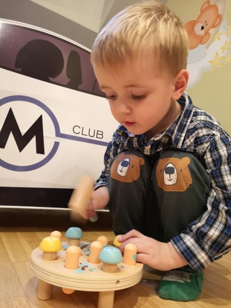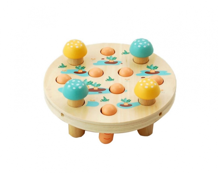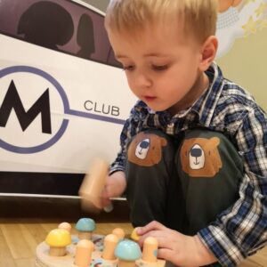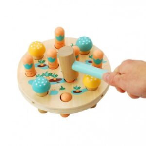 Dieťa pri hre zatĺka drevené kolíky v podobe mrkvičky do otvorov v doske.