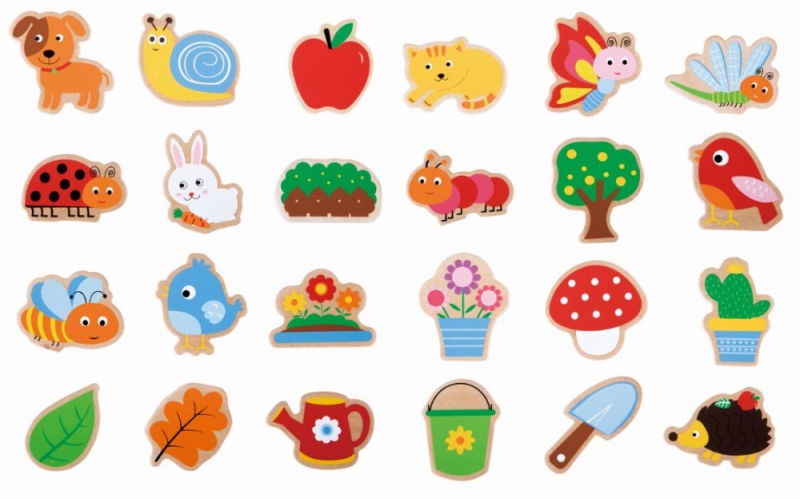 Táto sada obsahuje 14 drevených magnetiek znázorňujúcich zahrádku.