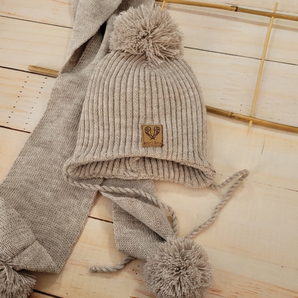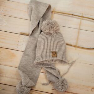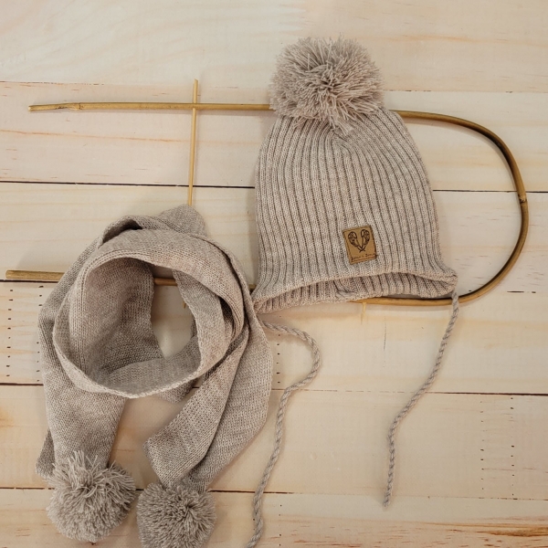 Dvojvrstvová zimná pletená čiapočka na zaväzovanie + šál s brmbolcami.