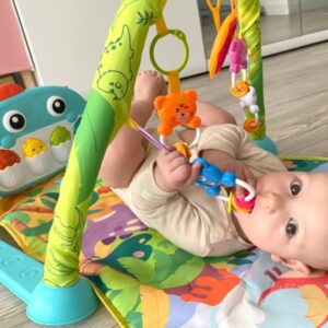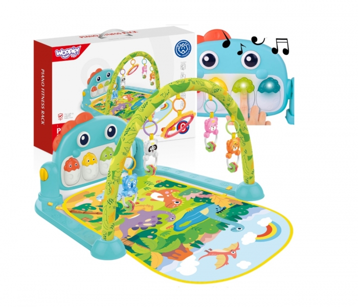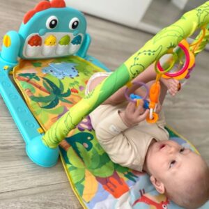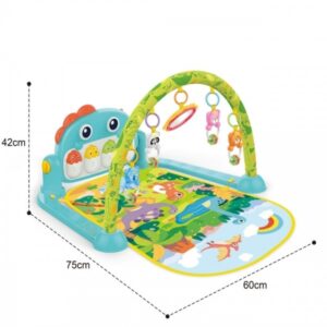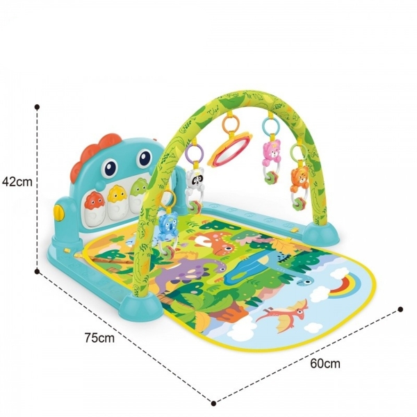 Výuková podložka Dino je produkt určený pre deti, ktoré sa rady hrajú poležiačky. Podložka je vybavená hrazdou, na ktorej visia hrkálky v tvare priateľských zvieratiek a zrkadlom, ktoré poteší bábätko. Multimediálny panel s veľkými tlačidlami spríjemní hranie a zmyslové hračky namontované po stranách pomôžu rozvoju dieťaťa.
