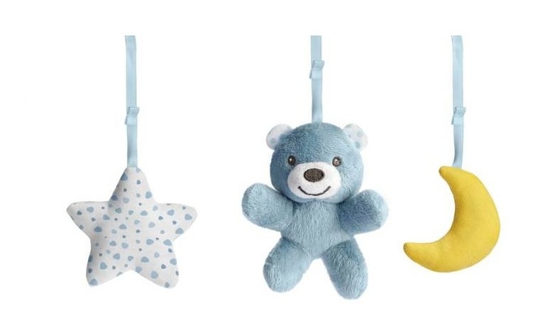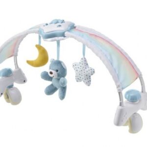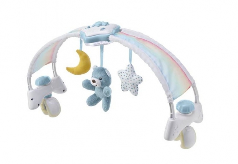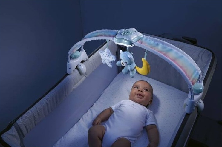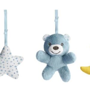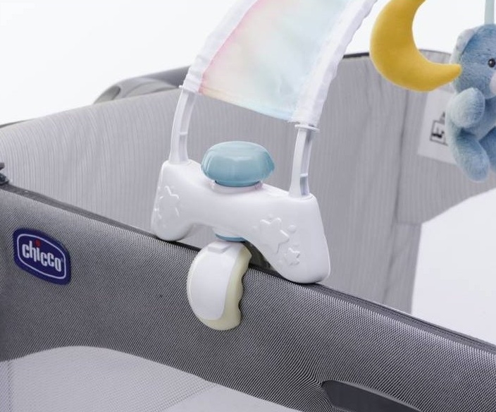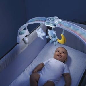 Vek 6 M + prenosná nočná lampa s projektorom na umiestnenie na nočný stolík. Látkové prívesky sú perfektné ako prvé hračky. Časový spínač 15 alebo 30 minút. melódie a 2 úrovne hlasitosti. 3 prívesky z mäkkého materiálu. Hračky sú odnímateľné. Kompatibilný s kolísky a posteľami so šírkou 55–65 cm. Pohodlný a bezpečný montážny systém.