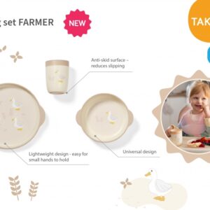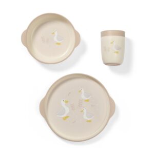 Súčasťou sady je tanier, miska a hrnček – perfektné na podávanie teplých aj studených jedál a na učenie sa piť z otvoreného hrnčeka.