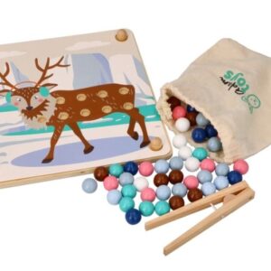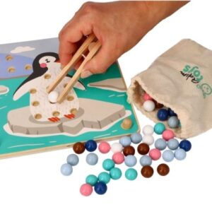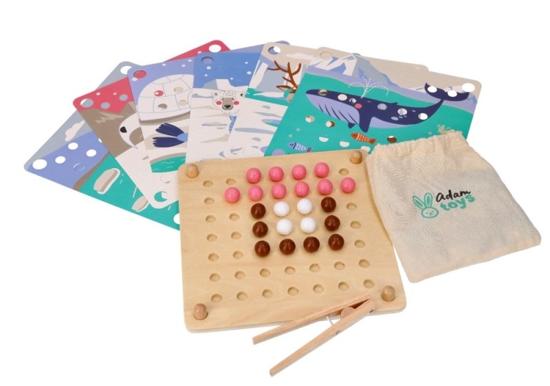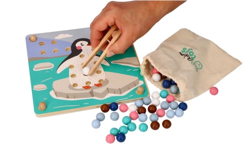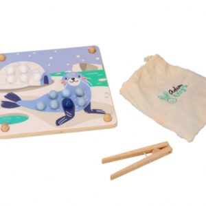 Arkádová hádanka s novými arktickými hrdinami. Sada sa skladá z dreveného stojana s vyhĺbenými otvormi, 6 farebných dosiek so zvieratkami zo série, 71 farebných loptičiek a drevených klieští.