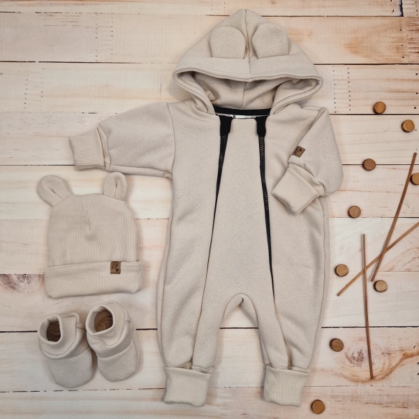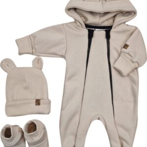 Materiál: Overálok (medvedík na vnútornej strane) 95% bavlna 5% elastan, rebrovaná čiapka: 95% bavlna 5% elastan, Topánočky: 95% bavlna, 5% elastan.