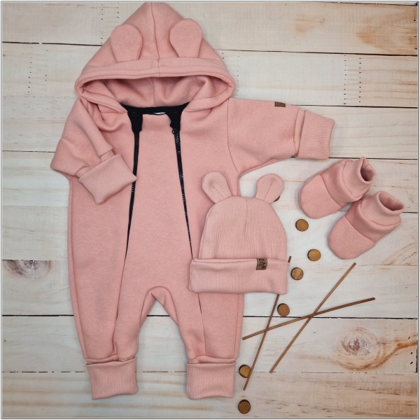 Materiál: Overálok (medvedík na vnútornej strane) 95% bavlna 5% elastan, rebrovaná čiapka: 95% bavlna 5% elastan, Topánočky: 95% bavlna, 5% elastan.
