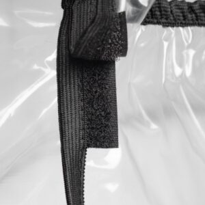 Súčasťou je veľké okienko, ktoré uľahčuje komunikáciu a prístup k dieťaťu bez nutnosti sňatia celej pláštenky. Vďaka upevneniu na suché zipsy je nasadenie aj zložení veľmi rýchle a jednoduché. Pláštenku ľahko zložíte a uschováte do priloženej praktickej taštičky.