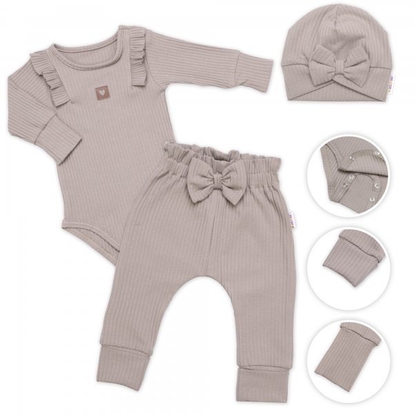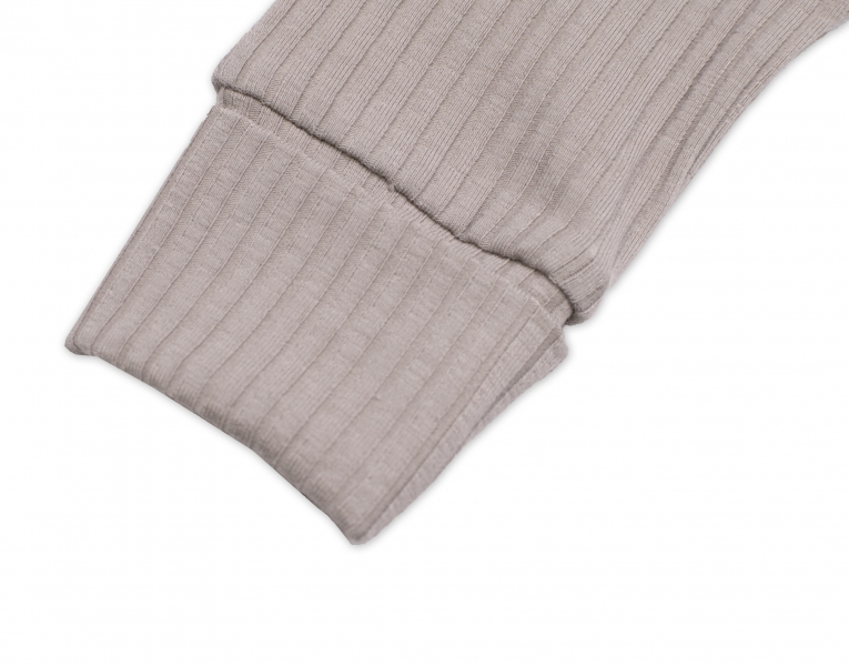 Rebrovaná rastúca sada z mäkkej bavlny predstavuje ideálnu voľbu pre bábätko. Body s dlhými rukávmi ponúkajú možnosť prispôsobenia dĺžky pomocou dvoch radov cvokov v rozkroku. Tepláčiky sú vybavené širokým vyhrňovacím pásom a dlhými nápletmi na nohavičkách. Vďaka týmto nápletom sa tepláčiky jednoducho prispôsobia rastu vášho dieťatka.