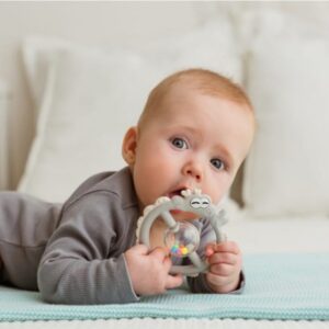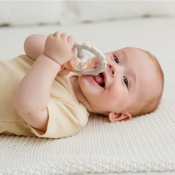 Náročné obdobie prerezávania zúbkov tým najmenším spríjemní hrkálku, hryzátko z bezpečného silikónu. Má špeciálne výstupky, ktoré jemne masírujú boľavé ďasná.