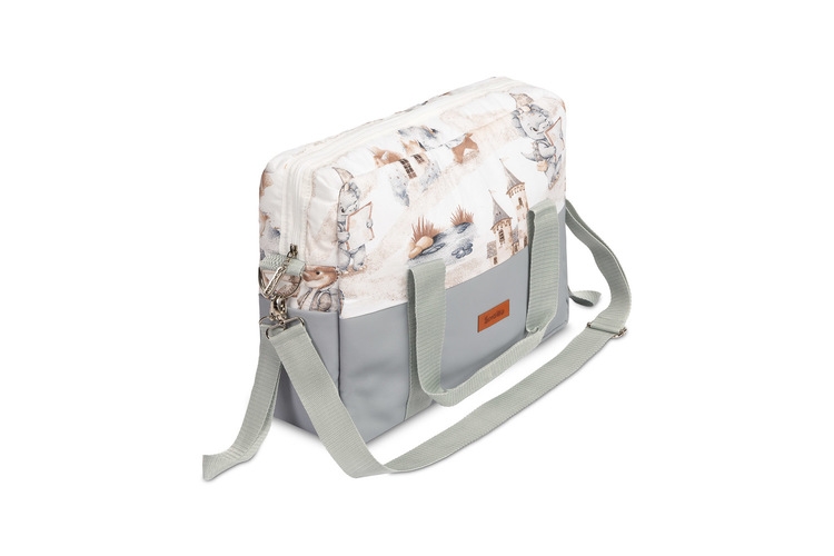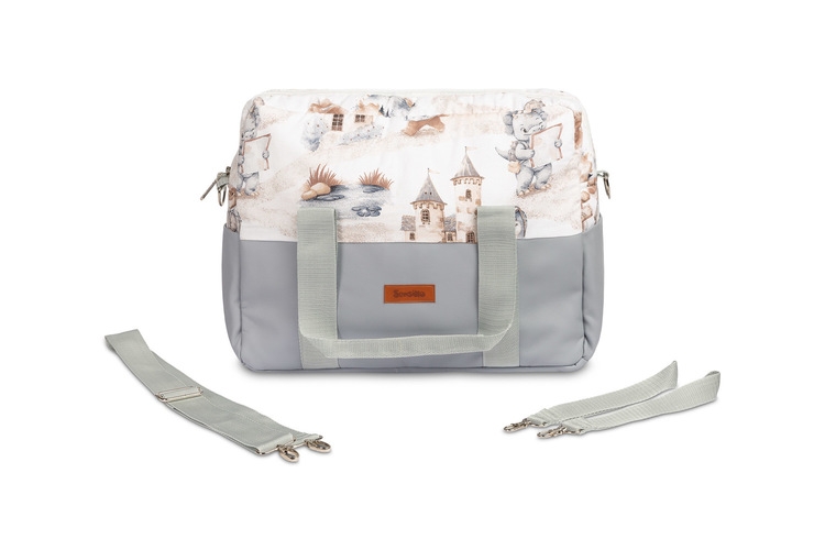 Univerzálne použitie : Taška je vybavená kovovými prvkami, univerzálnymi úchytmi pre zavesenie na rám kočíka a praktickým ramenným popruhom s dĺžkou cca 130 cm.