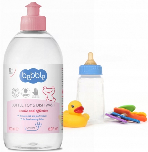Detské fľaštičky, hračky a doplnky umyte v roztoku 2-3 ml Bebble fľaštičky, hračky a prostriedku na umývanie riadu v 1 litri teplej vody. Silne znečistený riad alebo predmety so zaschnutým jedlom alebo zvyšky mlieka možno do takého roztoku najskôr namočiť. Po umytí všetko dôkladne opláchnite čistou vodou.