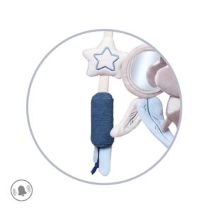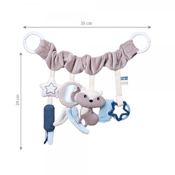 Prívesok na kočík a autosedačku NATURE je zmyslová hračka, ktorá pomáha stimulovať hmat a zrak a rozvíjať motoriku dieťaťa. Pripevnite ho ku kočíku, kolíske alebo autosedačke, aby sa vaše dieťa zabavilo pri prechádzkach a výletoch. Na prívesok potiahnutý na dotyk príjemným materiálom sme umiestnili hrkajúceho vtáčika, bezpečné zrkadlo s vyčnievajúcimi šnúrkami, šuštiaceho zajačika, prsteň a hviezdu. Zaujímavo vybrané prvky nabádajú na ich preskúmavanie a priťahujú pozornosť vášho dieťaťa. Vaša ratolesť sa baví, objavuje svet a zároveň rozvíja zrakovú a sluchovú koordináciu.