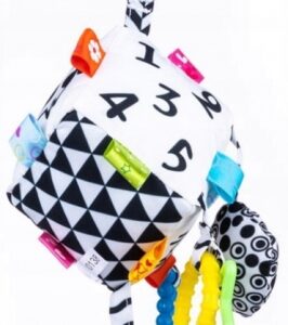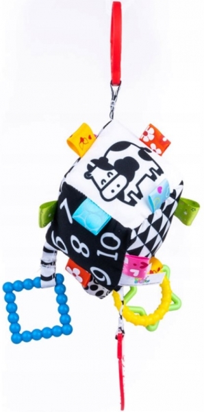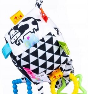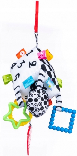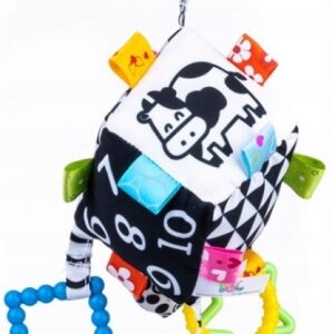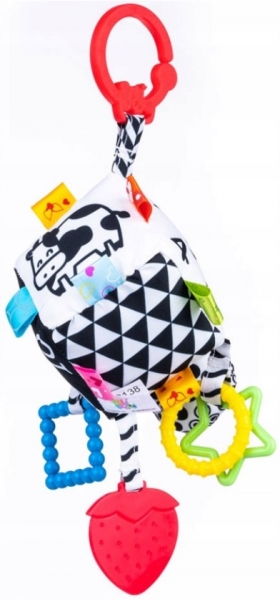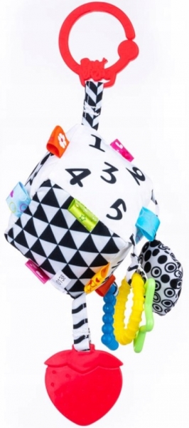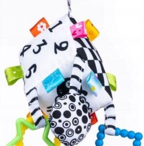 Geometrické vzory (trojuholníky a štvorce) a čísla v kontrastných farbách aj pekné a jednoduché obrázky zvierat zaujmú tie najmenšie a stimulujú ich zrak, má flexibilné hryzátko so štruktúrou, ktorá iste prinesie úľavu pri prerezávaní zúbkov.